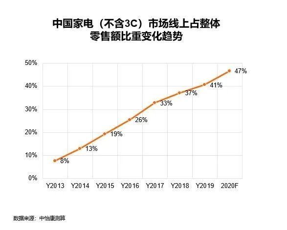 过去十余年,中国消费互联网经历快速发展,特别是2003年“非典”疫情助推线上消费激增,此后电商进入发展快车道。中怡康数据显示:截止2019年中国家电电商渗透率已经突破41%,今年有望突破47%,逼近半壁江山。高增长的背后,均受益于互联网的普及、信息技术的广泛应用以及人口规模红利优势。