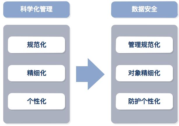 精细化管理是一种理念,是组织业务发展的指导思想,是组织发展到一定阶段的必要建设。精细化管理可分为规范化、精细化、个性化三个层面。精细化管理多用于生产制造领域,而数据安全与精细化管理的融合将解决粗犷的数据安全防护粒度,加深安全与业务融合度,全面支撑数据安全实现业务发展目标。