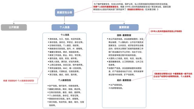 数据安全的对象为组织内部各种数据,在对象精细化管理前,需要大量摸家底、理数据的工作,以便准确有效对属性(列)分类分级。目前业界可参考的分类分级较少(贵州政府数据分类标准,工业互联网企业网络安全分类分级指南),没有明确的分级方法论,目前组织对自身内部数据进行分级时可参考《数据安全管理办法》、《个人信息安全规范》、《中华人民共各国政府信息公开条例》等上层建筑文件,再结合组织内部数据特性,抽取分类分级原则,形成有效、准确、可收敛的分类分级方法论。