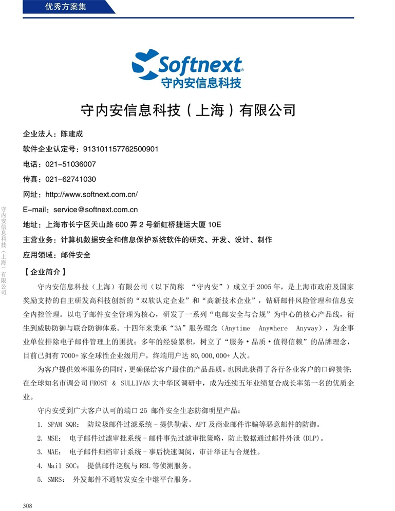 守内安的经典案例入选《2019中国数字化转型优秀方案集》,这是中国信息协会对于守内安在业界口碑与影响力的认可。守内安是上海市政府及国家奖励支持的自主研发高科技创新的“双软认定企业”和“高新技术企业”,自2005年公司成立以来,潜心钻研邮件风险管理和信息安全内控管理。以电子邮件安全管理为核心,研发了一系列“电邮安全与合规”为中心的核心产品线,衍生到威胁防御与联合防御体系。