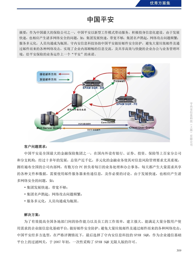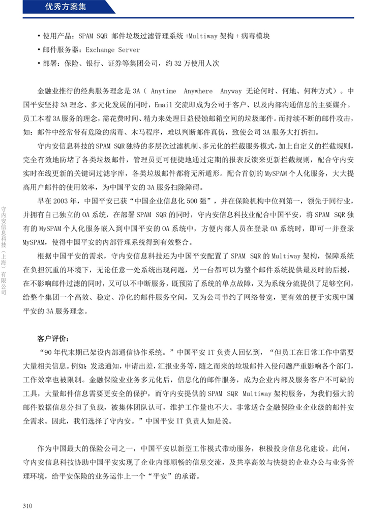 十五年来,守内安秉承“以客为尊”的3A服务理念(Anytime、Anywhere、Anyway 无论何时、何地、何种方式),为企事业单位排除电子邮件管理上的困扰;多年的经验累积,树立了“服务?品质?值得信赖”的品牌理念,目前已拥有7000+家全球性企业级用户,终端用户达80,000,000+人次。