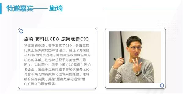 2020年3月6日,由CIO发展中心举办的新形式下的客户数字化运营线上云沙龙顺利召开,顶顶科技 CEO 施琦(前海底捞CIO)与参会嘉宾们分享了海底捞客户数字化运营实践,揭秘“顾客数字化运营“给CIO带来的巨大机遇。