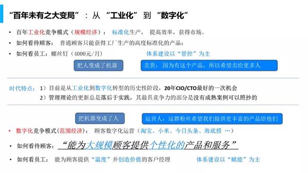 从商业模式角度看,现在是从“工业化”到“数字化“”转型的历史性阶段,正在经历“百年未有之大变局”,从竞争模式、如何看顾客、如何看员工都发生了变化。工业化的商业逻辑是标准化生产提高效率以期获得更大的市场,普通顾客只能获得工厂生产的高度标准化的产品,员工定位为螺丝钉,体系建设以管控为主;数字化的商业逻辑是范围经济,通过顾客数字化运营,能为大规模顾客提供个性化的产品和服务,员工定位是能为顾客提供“温度”并创造价值的客户经理,体系建设以“赋能”为主。具体来说,互联网平台与传统企业(快消零售餐饮)在商业模式上的差异,最根本的差异是数据的数量和数据的质量,没有差异的是业态。