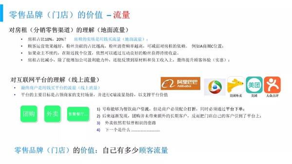 因此,零售品牌(门店)的价值在于,要从顾客和流量的角度来考虑,包括销售量、营收、利润等方面。其中,营收利润分为三个个部分:第一,对房租的理解是用租金来买商业地产的流量,即地面流量;第二,对互联网平台的理解是最终商户是用钱买平台的流量,即线上流量;除这两种流量之外还有最核心的私域流量,指的是品牌的顾客运营能力强于商业地产和平台,足够把其他平台的顾客流量吸引过来,进而转化成自己的流量,那么在品牌的顾客运营能力弱于商业地产和互联网平台,结果就是把流量引到了他们的平台上,最后流失顾客。如果把商业地产和互联网平台流量去掉,品牌本身还剩多少顾客、多少订单、多少销售额、多少利润等,这就是品牌和门店的净价值,最后比拼的也是顾客运营能力。