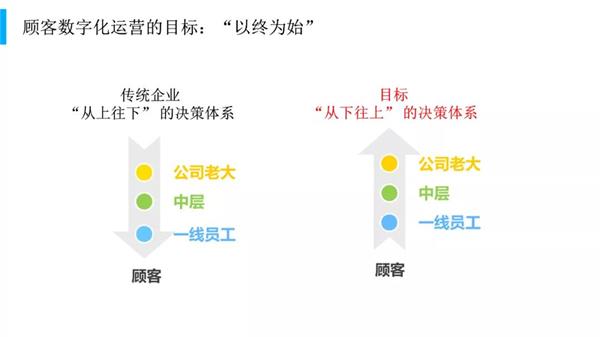 顾客数字化运营的目标是以终为始,来看传统企业的决策是从上往下,公司老大做决策,中层做具体执行,一线员工做螺丝钉,最后影响到顾客。顾客数字化运营的目标是要做成从下往上的角色,从顾客需求到一线员工,一线员工拥有直接感知和可以收集到顾客信息的权限,中层拥有更大的权限,最后支撑企业老大做决策。目前市场上真正在做顾客数字化运营的公司还是极少的,大部分还在摸索状态。