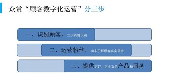 顾客数字化运营主要分为三步:第一,识别出顾客(粉丝)是谁;第二,运营粉丝,动态了解真实需求;第三,为他们提供更好的、更丰富的产品和体验。