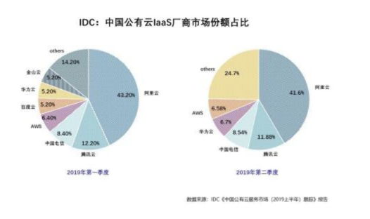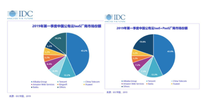 在IDC报告中,2019上半年中国公有云的IaaS(基础设施即服务)的市场份额见下图: