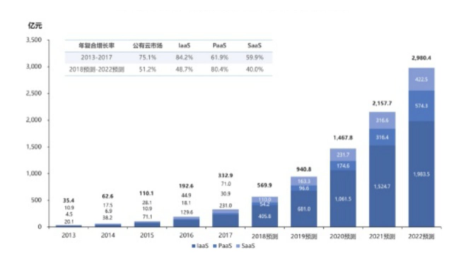 从大概规模看,若以中国信通院数据为参考,IaaS层270亿元的规模同比增速若在70%,则2019年为459亿元,2018年PaaS层的22亿元,到2019年大概为45亿元。
