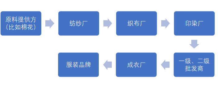以服装用纺织制造为例,上游的纤维等原材料在纺纱厂纺成纱线以后,转到中游的织布厂进行织造、印染厂进行印染,继而以成品布的形式在市场中流通并转到下游的成衣厂,最后由成衣厂生产并供货给服装品牌,比如熟知的优衣库、NIKE、阿迪达斯等。