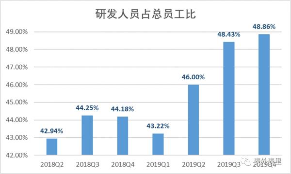 除了在研发层面花更多钱,小米还雇用了更多的研发人员。截止2019Q4,小米有8848名研发人员,占总员工比为48.86%,是7个季度以来的最高水平。