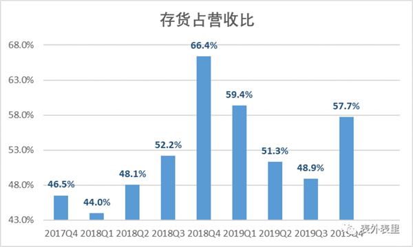 根据小米财报,2019Q4其存货同比增长了10.5%,占营收比上升至57.7%。可以发现,与研发费用占营收比的增长规律相似,同样是从2018Q4开始,小米的存货占营收比迅速增加。