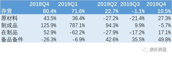 而在存货结构中,很明显的是,制成品同比增长从2019Q1开始迅速下降,Q4甚至负增长5.7%。同时,原材料、在制品、备品备件2019Q4的同比增长数据较前几个季度均在上升。