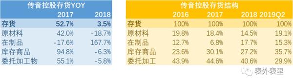 再看传音详细的存货情况,与小米存在很大的差异。从存货同比增长看,传音的在制品(即生产过程中的半成品手机)存货于2018年激增,涨幅达到167.7%,其余原材料、库存商品和委托加工物(委托外部厂商加工的原材料或者半成品)的占比都在下降。从存货结构看,传音2019Q2涨幅最大的是库存商品,此外在制品和委托加工品都有所下降。