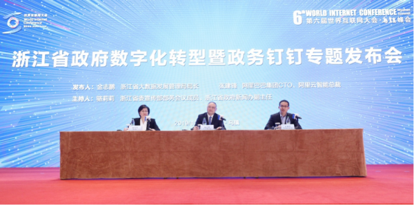 图为2019年世界互联网大会政务钉钉发布会,图中为浙江省大数据发展管理局局长金志鹏、图右为阿里云智能总裁张建锋