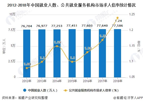 随着我国毕业生人数的不断激增,我国就业压力也不断加大。2012-2018年我国就业人数总体呈上升趋势,2018年达到77586万人,较2017年略有下降。公共就业服务机构市场求人倍率为1.24倍,上升幅度较大。据2020年《社会蓝皮书》显示,2019年就业总体平稳,新增就业人数超出年初计划目标,完成了目标的116.3%,总体而言,我国就业需求较大。