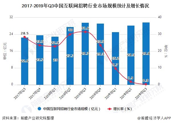 在我国高校毕业人数不断增加,就业人员体量、市场求人倍率不断上升的背景下,我国互联网招聘市场规模不断上升,增速趋缓,同时我国互联网市场规模呈明显的周期性。2019年第三季度我国互联网招聘市场规模达到29.8亿元,实现历史新高,同比增长0.3%。