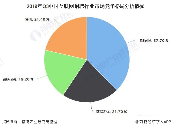 随着我国互联网招聘市场规模不断扩大,互联网招聘市场竞争愈发激烈,主要呈58同城、前程无忧、智联招聘三足鼎立局面,58同城以其服务用户多,服务升级 用生态优势构建高效可靠的招聘体系占优,占比37.70%;其次,前程无忧凭借多年的经验,在互联网招聘市场积累较多的忠实用户,占比21,70%;智联招聘依托大数据优势,引领招聘行业变革,占比19.20%,其他占比21.40%。