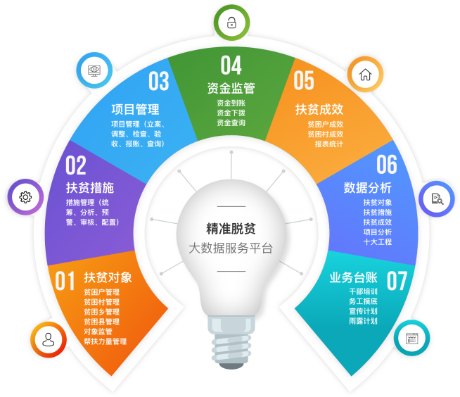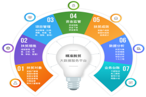 精准脱贫大数据服务平台建设按照“六个精准”的总体要求,紧盯“全省脱贫攻坚政策方案”的具体落实情况。建设内容包括扶贫对象管理子系统、扶贫措施管理子系统、扶贫成效管理子系统、绩效考核子系统、数据分析子系统、政策展示子系统、数据交换管理子系统、项目资金管理子系统、手机APP子系统、监测中心等十大子系统。主要解决五个方面的问题。一是通过扶贫动态管理,精准掌握省市县乡村五级贫困人口的各种分布情况、人员结构情况、收入来源情况、生产生活条件等信息,通过与省级部门数据进行对比审计,保证全省扶贫对象精准;二是通过扶贫措施监督落实,掌握全省十大工程及行业措施的具体落实情况;三是扶贫成效评估分析,通过指标量化,明确全省贫困脱贫成效情况及各项脱贫指标完成情况;四是绩效考核奖惩依据,通过量化考核指标,对各地区扶贫指标完成情况进行分析,为全省脱贫攻坚考核工作提供决策依据。五是数据分析结果利用,通过数据挖掘,实现对扶贫工作相关数据进行分析,为各级党委政府脱贫攻坚行动提供决策依据。