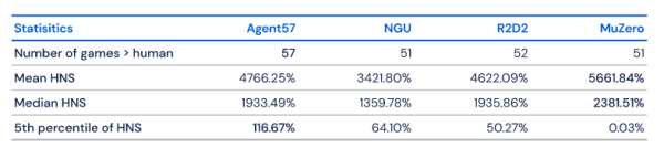 DeepMind将Agent57与当前最先进的算法MuZero、R2D2和NGU做了比较,Agent57显示出了更高的平均性能(100)。