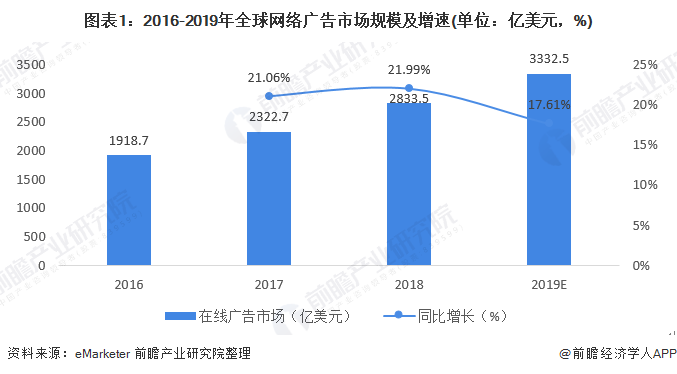 据eMarketer数据,2016-2018年全球数字广告市场规模总体呈逐年增长态势。2018年全球网络广告市场规模为2833.5亿美元,同比增长21.99%。初步估算2019年市场规模约3332.5亿美元。