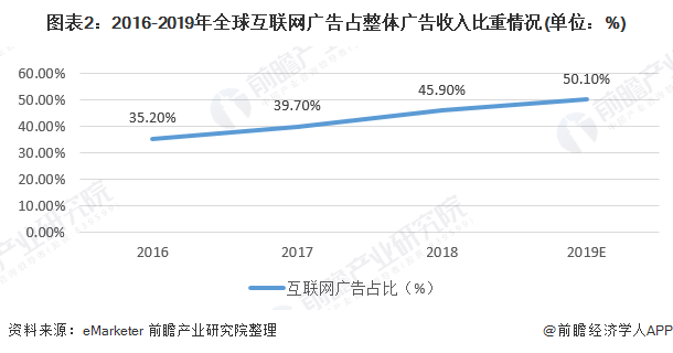 据统计,2016-2018年期间全球互联网广告市场在全球市场中的份额稳步提升,2018年,全球互联网广告市场占整体广告收入市场份额为45.90%,初步估计2019年比重近50%。