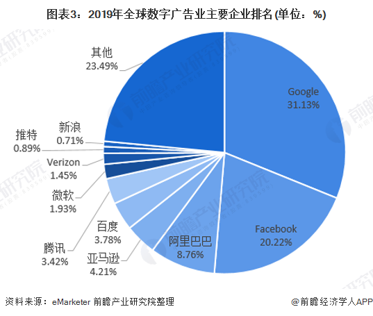 据统计,2019年谷歌仍占数字广告市场主导地位,其数字广告收入高达1037.3亿美元,全球市场占比高达31.1%,远超排位第二的Facebook。中国阿里巴巴则排位全球第三;全球前十企业市场累计占比为76.51%。