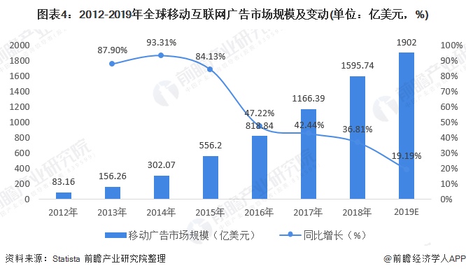 2012-2018年移动广告市场规模发展迅速,增速有所下降。2019年全球移动广告市场规模近1902亿美元,同比增长19.19%。