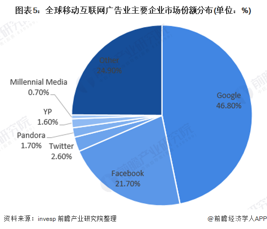 谷歌在移动广告市场份额46.8%,占行业主导地位,Facebook紧随其后