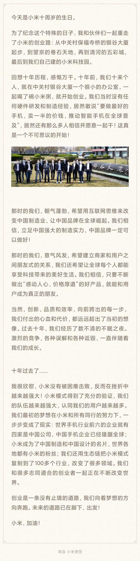 “十年过去了……我很欣慰,小米没有被困难击败,反而在挫折中越来越强大,小米模式得到了充分的验证,我们的队伍越来越强大,认同我们的用户越来越多。”