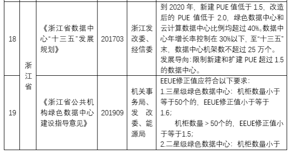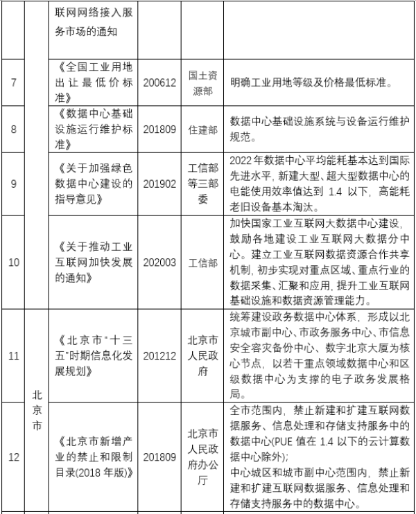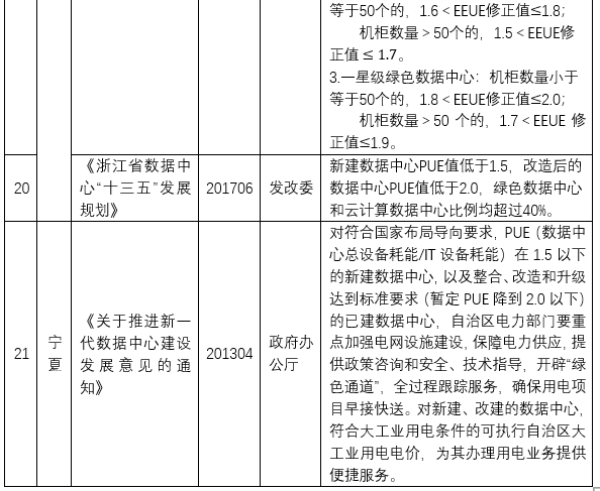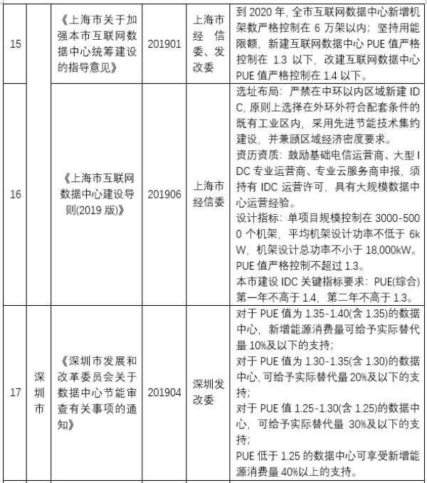 北京、上海对于新建数据中心相继出台了严格的限制文件,例如北京于2018年9月发布的《北京市新增产业的禁止和限制目录(2018年版)》全市范围内,禁止新建和扩建互联网数据服务、信息处理和存储支持服务中的数据中心(PUE值在1.4以下的云计算数据中心除外);而在中心城区和城市副中心范围内,禁止新建和扩建互联网数据服务、信息处理和存储支持服务中的数据中心。上海于2019年1月发布的《上海市关于加强本市互联网数据中心统筹建设的指导意见》,要求全市互联网数据中心新增机架数严格控制在6万架以内;坚持用能限额,新建互联网数据中心PUE值严格控制在1.3以下,改建互联网数据中心PUE值严格控制在1.4以下。可见,北京和上海对于新建数据中心的PUE值已经进行了严格限制,相比较而言上海是以限制加鼓励的形式,而北京为严格的限制。