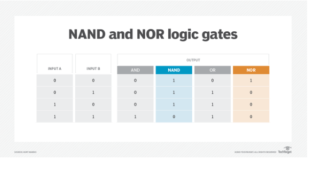 NAND和NOR分别涉及到布尔逻辑函数中的逻辑“和”(and)以及“或”(or)。如下所示,NAND和NOR都生成响应两个二进制输入的输出。