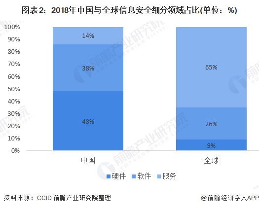 根据CCID公布的数据分析可知,2018年我国信息安全行业以硬件为主,软件为辅,服务最弱,分别占信息安全市场的48%、38%和14%;与之形成对比的全球信息安全领域中,安全服务占据65%以上的市场。国内信息安全行业以安全硬件为主的特点与全球以安全服务为主的特点有着明显的差异。前瞻认为主要由三个因素导致:一是中国作为制造大国,制造是硬件的基础故而以硬件起步;二是我国的服务意识与相关IT技术弱于全球水平;三是我国企业安全支出更多为合规驱动,主动防御意识弱。近年来,随着中国市场5G技术及云服务理念的渗透,网络信息安全商业模式将由软硬件产品向服务逐步转移,该变化符合全球信息安全发展的趋势走向。预计2021年,中国安全服务市场份额有望提高到20%左右。