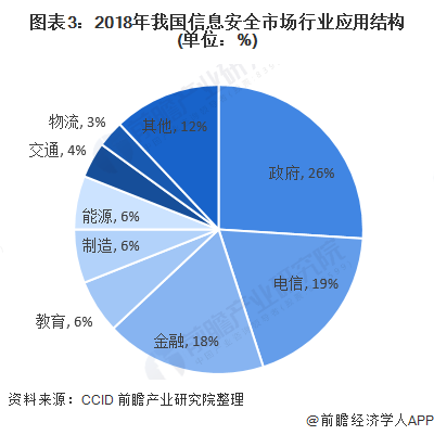 国家信息安全是推动整个信息安全行业前进的首要动力,一旦国家信息被不法分子泄露,造成的政策和经济损失无法估量。其次是个人信息的电信业和“离钱最近”的金融业。从下游需求来看,2018年政府、电信和金融等涉及国家安全和国民经济命脉的行业是信息安全产品的主要需求对象,总占比超过60%。智能金融5G、人工智能、云计算等先进信息技术的首批试点应用,未来我国信息安全市场中金融的应用将进一步提高。