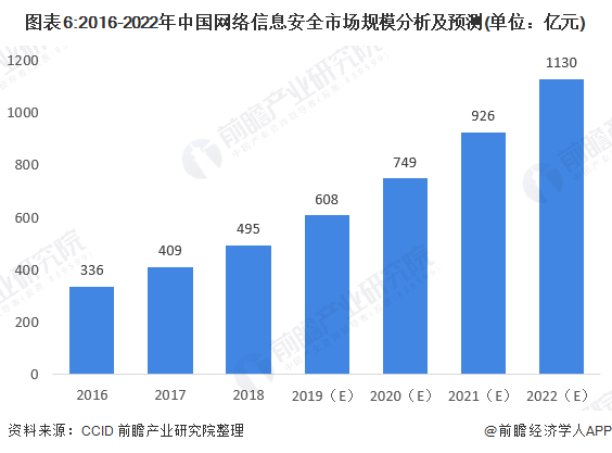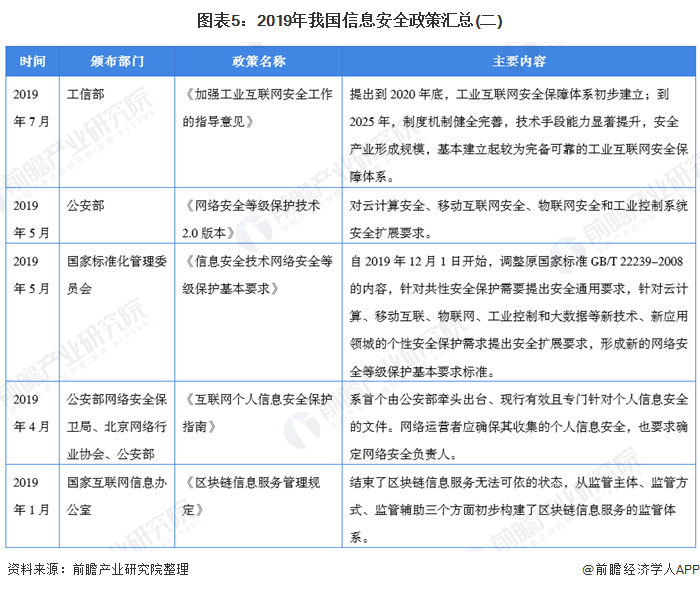2019年1月,我国颁布《区块链信息服务管理规定》;2019年10月颁布《中华人民共和国密码法》,政策频发的2019年象征着我国的信息安全市场正在向发达国家靠近。尽管我国现存的信息安全市场中仍以硬件开发为主,软件开发为辅,但随着5G技术、物联网和云计算等新兴信息技术在国家安全、个人信息和金融领域的应用,我国的信息安全将逐步向安全服务转型,前瞻初步估计三年内我国信息安全的市场规模将破千亿。