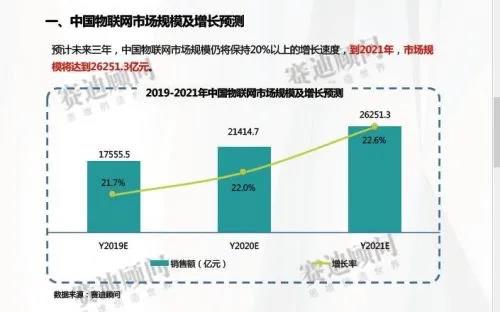 另依据赛迪顾问整理的《2019-2021年中国物联网市场预测与展望数据》显示,2019年中国物联网市场规模将达到1.76亿元人民币,预计到2021年将达到2.6万亿元人民币。