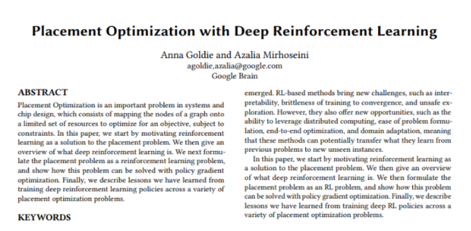 在Azalia Mirhoseini这篇ArXiv论文中,她和谷歌高级软件工程师Anna Goldie表示,对芯片设计进行了足够长时间的学习之后,团队开发的算法可在不到24小时的时间内为谷歌TPU完成设计,且在功耗、性能、面积都超过了人类专家数周的设计成果。