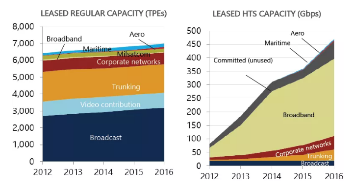 目前,各种HTS都在通过这种路径来扩大带宽。Viasat在建的GEO HTS——Viasat-3容量达到1Tbps,这几乎是常规卫星容量的1千倍。Hughes和Eutelsat公司分别在建Jupiter-3、KONNECT容量也达到500Gbps。这三大VHTS(超级HTS)都将在2021年发射。HTS容量的迅速提升使得GEO HTS的单位Gbps制造成本降至百万美元以下,从而在服务能力和资费水平方面与地面宽带网络旗鼓相当。随着VHTS的推出,卫星通信在信息网络中的吸引力将会得到有力的提高。