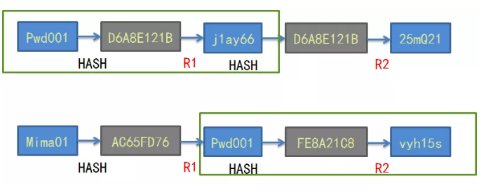 查表过程:假设拿到了一条HASH值“670B1E”,首先进行一次R运算,得到了“283651”,查询所有链尾是否有命中,如果没有,则再进行一次HASH、一次R,得到了“819287”,再次所有链尾,可以得到看出已经命中。