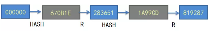 先对原始数据“000000”进行一次HASH运算得到“670B1E”,再对HASH值进行一次R运算,R是一个定制的算法可以将HASH值映射到明文空间上(这里我们的明文空间是000000~999999),R运算后得到“283651”,再对“283651”进行hash运算得到“1A99CD”,然后在进行R运算得到“819287”,如此重复多次,得到一条哈希链。然后再选用其它原始数据建立多条哈希链。最终仅将链头和链尾保存下来,中间节点全都去掉。