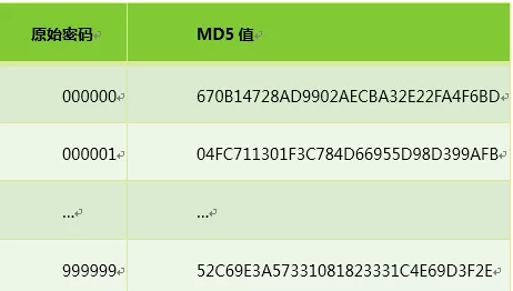 单向HASH算法由于不能进行解密运算,只能通过建表、查表的方式进行碰撞,即将常用的密码及其对应的HASH值全计算出来并存储,当获取到HASH值是,直接查表获取原始密码,假设用MD5算法来保护6位数字密码,可以建如下表: