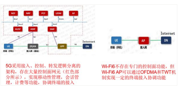 从接入网对接入终端的调度协调方式看,5G采用的是基站来总负责协调,划分了专门的控制面功能,用核心网络的控制面功能指挥协调大量终端。而Wi-Fi6则采用了“协调+竞争”的方式。Wi-Fi5以前完全是竞争即CSMA/CA(多路访问/冲突避免),终端数量较多时,各个终端会竞争与AP通信;这就是大家经常在万人大会上看到无线信号很强、但是无法通信的原因。因为Wi-Fi5是完全竞争机制,大量的设备竞争冲突使得传输效率急速降低。Wi-Fi 6则引入了OFDMA和TWT机制,无线AP可以协调终端的收发行为,让整网的传输更有序,最大可能地减少冲突。