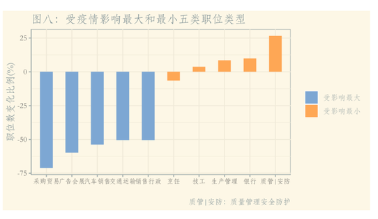 而受影响最小的五类职位分别是烹饪、技工、生产管理、银行和质量管理安全防护。质量管理安全防护类的职位相比于2019年同期增加了25%,这可能与疫情期间的安全防护需求突然增加有关。