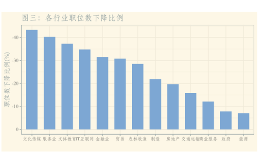 报告显示,文化传媒行业和服务业受影响最大,招聘职位数下降幅度超过了40%。其次是文体教育业、IT互联网行业、金融业和贸易批发零售行业,下降幅度在30%到40%之间。受影响最小的行业是政府非盈利机构和能源矿产行业,职位数相对2019年下降比例低于10%。
