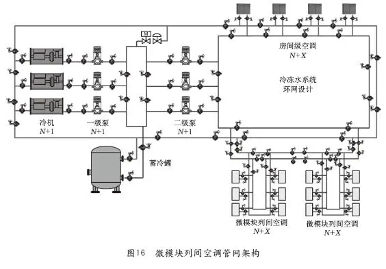 数据中心的发展,列间空调和微模块可以有效缩短气流的路径,消除局部热点,提升冷却效果,降低气流输配能量消耗,所以微模块和行间空调开始大量应用。但是微模块和列间空调管路设计有着更高的要求,一方面它需要大量的空调设备和相关的管道铺设,另一方面微模块和列间空调直接靠近服务器,无法通过挡水墙和主设备分离,所以要求管道的每一个需要隔离的部位均采用双阀门设计,管网架构如图16右下部所示。