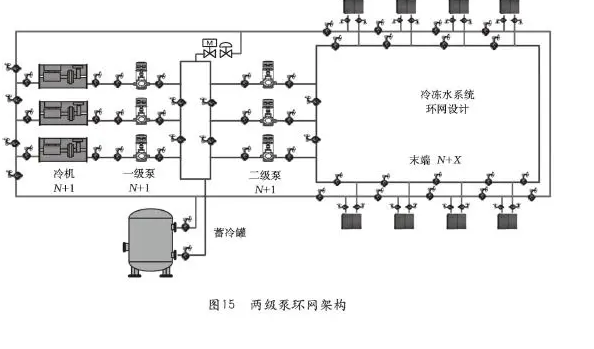 冷冻水侧构成比较复杂,如水泵设计可以选用单级泵,也可以选用两级泵;水泵、冷机对应方式也有多种形式,可以多机对多泵设计,也可以是一机一泵形式;到末端管路可以单管路、双管路和环网结构,蓄冷方式可以考虑串联,也可以考虑并联,下列设计方式是目前数据中心典型的设置方式。