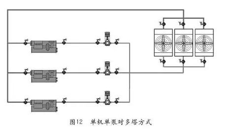 对上述两种方式的组合应用,借鉴了单机单泵单塔方式和多机多泵多塔方式两者的特点,有单机单泵灵活性,也有多塔架构的节能性能,如图12,但系统的维护性不如多机多泵多塔方式。