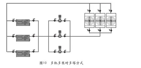 多机多泵对多塔的形式,就是多台并联水泵和多台并联冷机串联后,再和多台并联冷却塔串联,如图10,这样情况下可以提升机组和冷机的冗余度,相当于提升系统组件的可用性,同时可以充分利用冷却塔的散热能力,降低冷却水温,提升冷机效率,达到节能目的;缺点是开关机必须执行相应程序,如运行中不开启的机组水路必须关闭,否则部分机组会出现水流旁通降低机组COP问题。