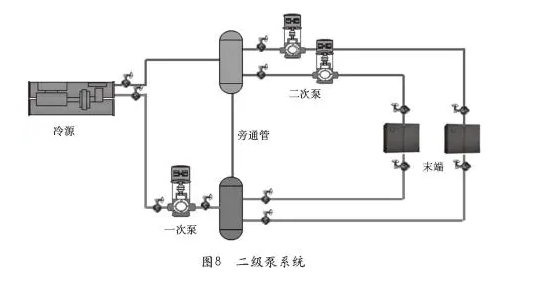 二级泵系统是指冷源侧和负荷侧分别配置循环泵的系统,冷源侧循环泵和负荷侧循环泵是相互分开的。由冷水机组、供回水总管、一次泵和旁通管组成一次环路,也称冷源侧环路,该环路水泵曲线可以选用平坦性;由二次泵、空调末端设备、供回水管路与旁通管组成二次环路,也称负荷侧环路,该环路水泵曲线可以选用陡峭性;这样的选择有利于制冷机组运行的平稳和保证蒸发器的安全运行,同时降低输配能耗,和一级泵相比,节能潜力较大,在大型数据中心,冷冻站同时供给多个数据中心机楼,采用二级泵设计可以作为优先选择的节能方案。