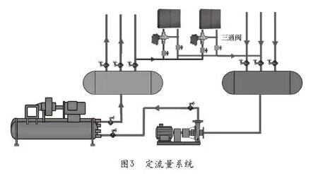 在冷冻水机房空调上安装三通阀,如图3所示,当空调全负荷运行时,电动三通阀处于直通状态,旁通关闭,冷水全部进入空调制冷,当机房负荷较小,温度控制器调节三通阀旁通打开,冷水旁通直接进入回水管,回到冷机;定流量过程中系统循环水量保持不变,通过控制三通阀来改变供水量和旁通水量,从而改变冷冻水型机房空调的制冷量,对于制冷主机来说则是水量始终不变,仅仅是改变了供、回水温度。定流量系统水泵一般采用定频设计,也可以采用变频启动,但这里的变频器并不作为调速用,而是改变水泵的启动性能和防止水锤现象。定流量系统简单,操作方便,也不需要繁琐的自控设备,但由于不管机房热负荷大小,水泵始终在最大流量运行,因此水泵的功耗较大,特别是机房负荷较小时,运行费用较高,不符合数据中心节能减排的宗旨,该设计仅在小规模的数据中心采用。