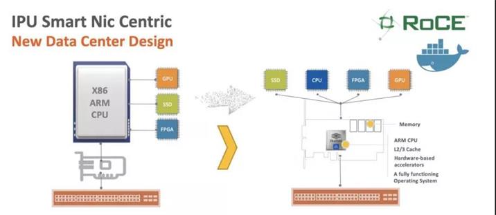 以 Smartnic 为中心的数据中心架构设计,中心思想就是 Offload CPU 的功能。传统 GPU, SSD, FPGA 数据跨服务器通讯都需要通过 CPU 中转,CPU 成为网络发展的瓶颈。引入IPU之后,传统的GPU和SSD可以更有效的通过RoCEv2和NVMEoF来提供更高带宽和低延时业务。